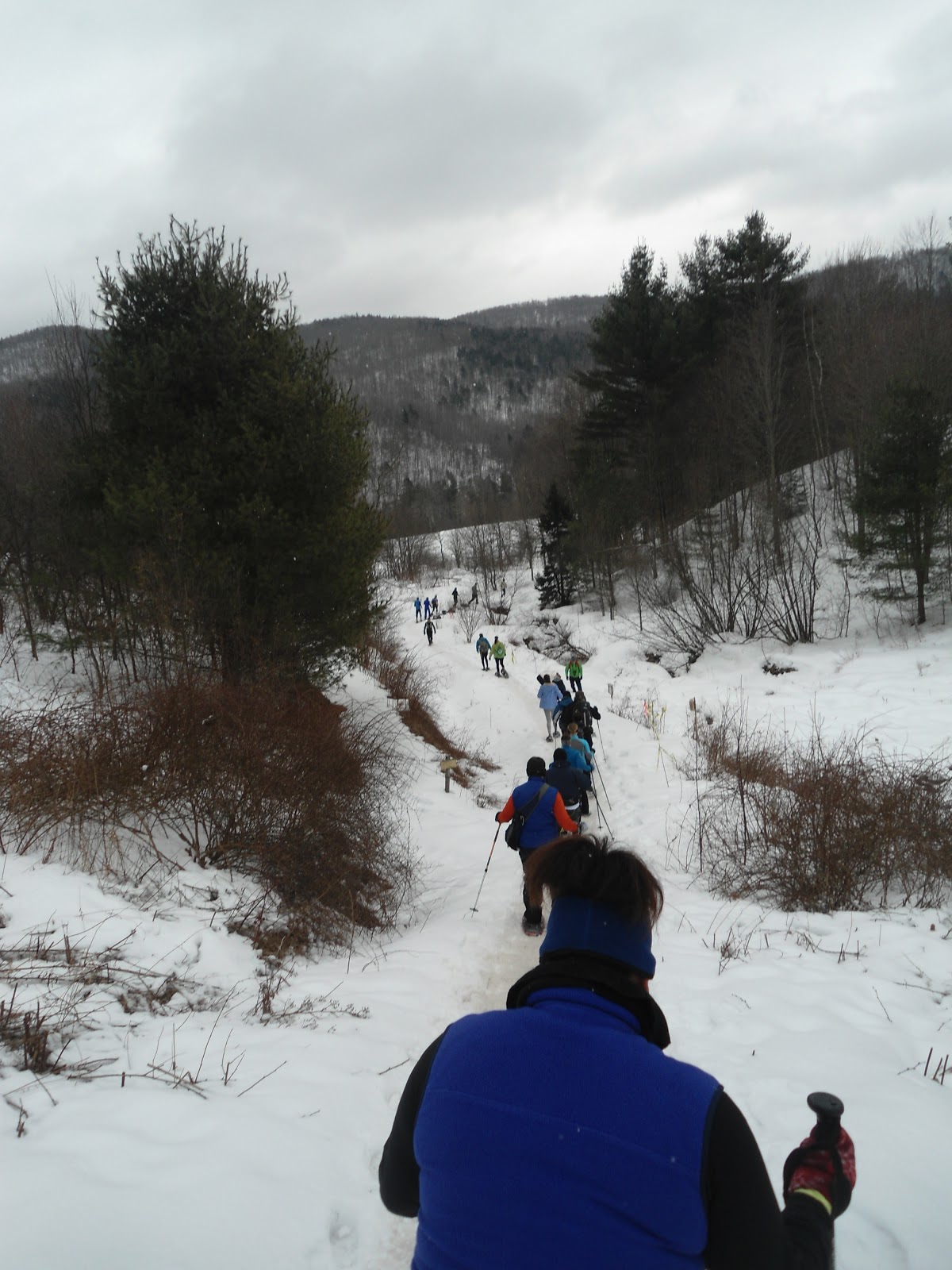 All of the extra time gave me the opportunity to really think about what I was going to wear for the race. Yes, I grew up in Vermont, but having been transplanted to the South for a decade seemed to have reset the “how to survive in the cold” instincts most Vermonters posses. I decided that a layer of underarmour tights was best paired with some knee high smartwool socks, and ANOTHER pair of tights over the top of those. An underarmour cold gear top, New England Spahtens tee shirt, and a wind blocking soft shell jacket on the top half (no, it wasn’t windy). As you can guess, I way overdressed, but I’d always rather be too hot than too cold. But the most important decision of the day was footwear. Last minute I decided to ditch my boots and run with my Merrell Proterra VIM Sport’s. The trail was packed, I have had experience using these shoes with snowshoes before, and they were FAR more comfortable to run in than boots. This was a decision that I would be incredibly happy with, and would even make up for the fact that I ended up sweating buckets in my many layers of clothing.