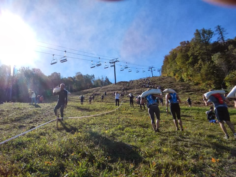 And not your typical Spartan Pancake sandbag carry. No, this was an honest to goodness “the town is flooding, line up some of these sandbags” awkward, heavy sandbag. Word on the street is they were anywhere from 50-60 pounds each (though I’ve heard some people claim heavier). And we were to take these sand bags straight UP a ski slope.