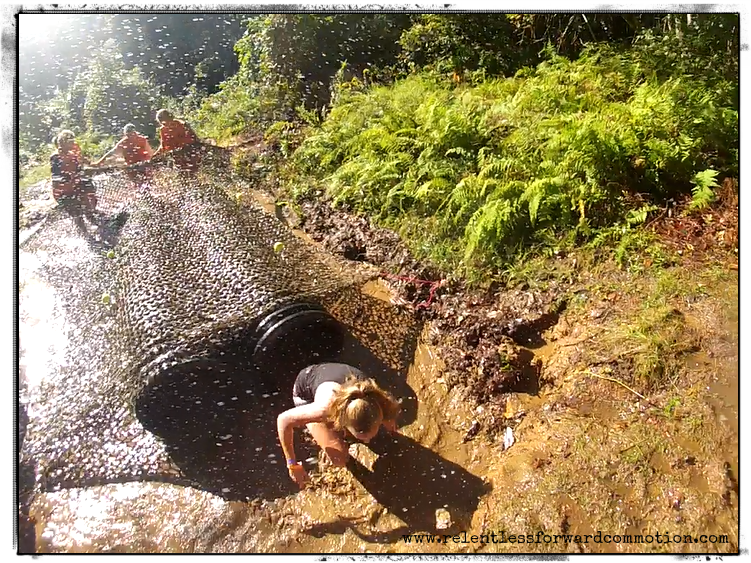 Venue/parking/festival: A Parking close to venue, great festival atmosphere, plenty of vendors, port-a-potties, etc. Free bag check, showers in parking lot. Spectator fee was $5, but the spectators were able to see the start, finish, and one obstacle near the festival area. Further, spectators were able to walk about 200 yards uphill to a huge field that contained NUMEROUS obstacles. A kids race was also available, that appeared to run at various times throughout the day, and finished in the same mud crawl as the adults (though kids were kept to one side).