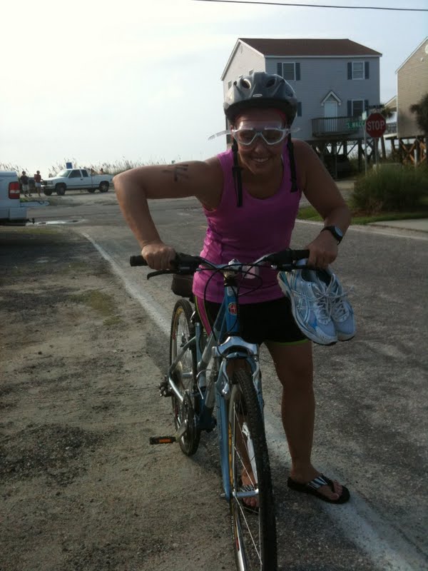 This was Hope’s very first ever triathlon, and she was a nervous wreck. Two peas in a pod we are! I remember feeling/acting the very same way for my first tri.  We racked our bikes.  I showed her how to set up transition. We walked over the dunes to check out the ocean. We listened to the pre-race directions.  And JUST as we were grabbing our caps and goggles to head down to the beach we heard a loud…