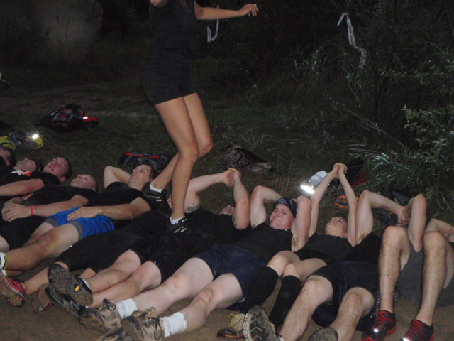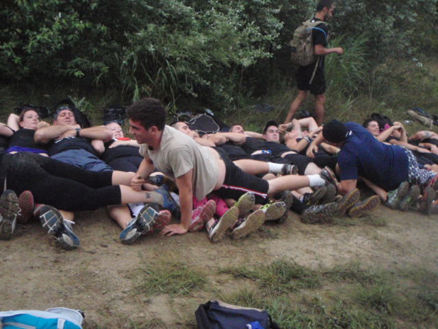 Before you knew it, we were all laying on the dirt (and by dirt, I mean giant rocks digging into my spine) road, doing some sort of crazy “rocking chair” team move.  Which I’m sure works great with 5 or 6 people in one of those silly team building exercises your freshman year in college.  With almost 200 people it’s near impossible