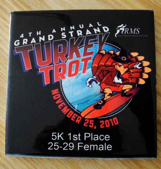 BUT I did get 1st in my age group and 5th woman overall, so I am really pleased with that. Regardless of distance, I beat a ton of people (19th out of 218 5k runners), and I earned my TURKEY (and my surfing turkey ceramic tile, awesome prize!)